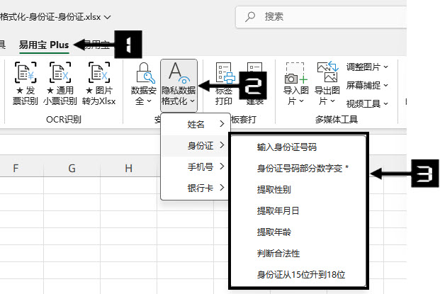 单击【易用宝plus】→【隐私数据格式化】→【身份证】,单击对应的菜单进入操作。