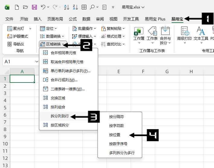 单击【易用宝】→【区域转换】→【拆分列都行】→【按位置】。