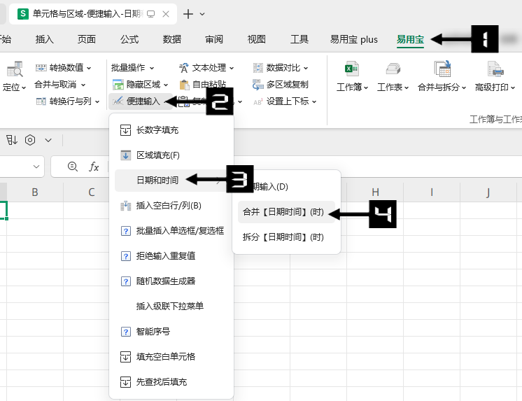 单击【易用宝】→【便捷输入】→【日期和时间】→【合并【日期时间】(时)】。