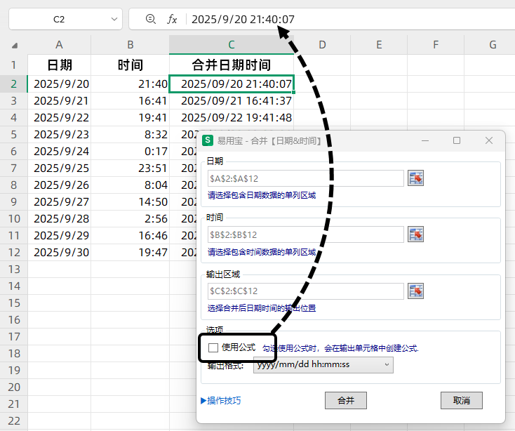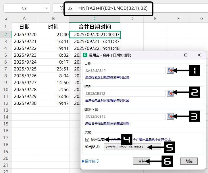 ①选择日期单元格区域。 ②选择时间单元格区域。 ③选择合并日期时间输出单元格区域。 ④如需保留公式,合并时勾选“使用公式”。 ⑤选择输出格式。 ⑥单击【合并】。