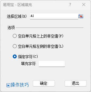 一共有三种不同的选项分别为:【空白单元格之上的非空值】、【空白单元格左侧的非空值】和【指定字符】,可以选择其中一项对数据区域进行操作。