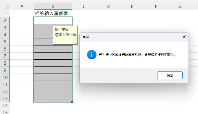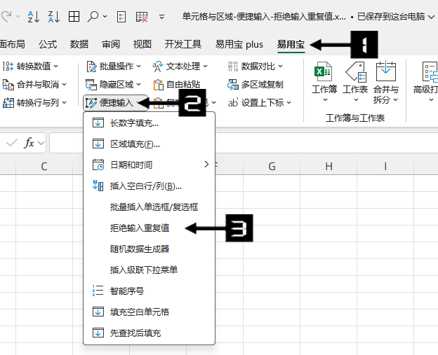 先选择需要拒绝输入重复值的单元格区域,单击【易用宝】→【便捷输入】→【拒绝输入重复值】。