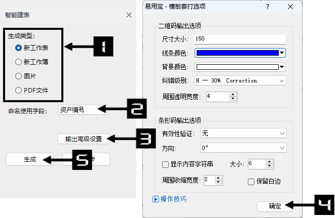 ④ 在输出高级设置中设置二维码尺寸、颜色等参数。